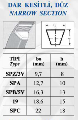 Satın Alma Notu: Dar V kayışları (SP serisi), klasik V kayışları ile aynı kasnaklarda kullanılamaz. Bu kayışlar için özel olarak tasarlanmış dar profilli kasnaklar gereklidir. Dönüşüm yaparken mutlaka teknik ekibimize danışın.